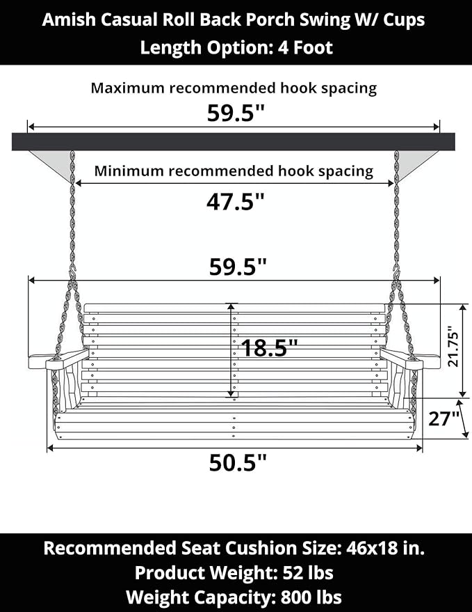 - Included Hanging Chains: two-point hanging zinc-plated chains for ceilings up to 8 ft.; Made in the USA, Handcrafted wooden front porch swing made in Pennsylvania, minor assembly required