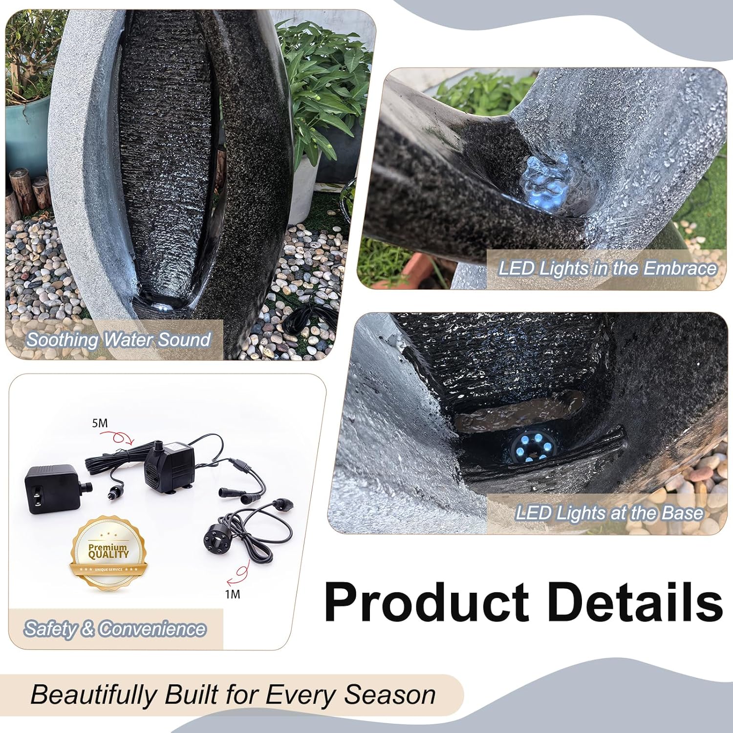 - Integrated LED Illumination & Certified Safety: Elevate your evenings with the enchanting glow of 6 warm LED lights, beautifully illuminating the cascading water. For your peace of mind, this decorative water feature includes a UL-listed submersible pump and a generous 5-meter (16.4 ft) electrical cord, ensuring safe and reliable operation for years of enjoyment