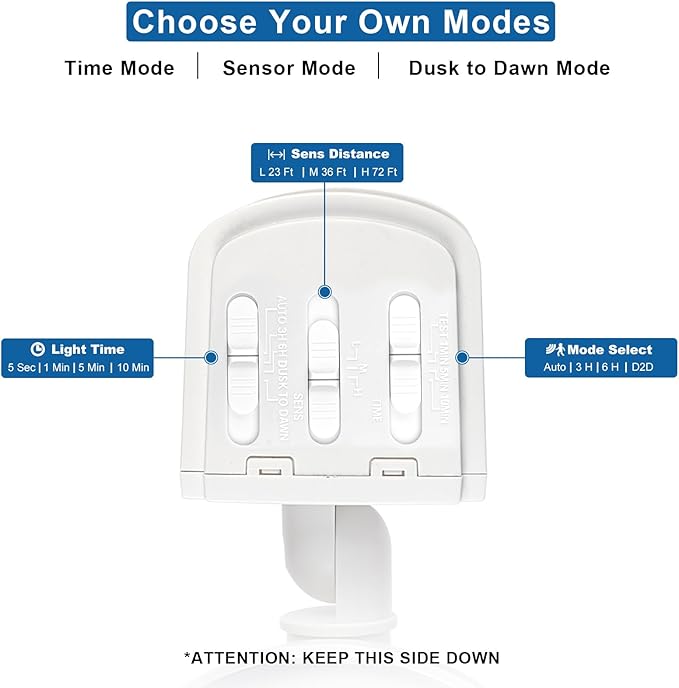 - Motion Sensor AUTO Mode - Our lights have daylight and motion sensor, the motion is detected with 180 degrees swiveling angle, sensing light levels and motion up to max 72 feet. Auto ON for pre-determined time(1/5/10MIN) when people or other living objects are detected within the sensing area, and Auto OFF after no further motion is detected. Built-in PIR motion sensor of our outdoor lights, it has a long-range of distance and a wide-angle for motion detection.
