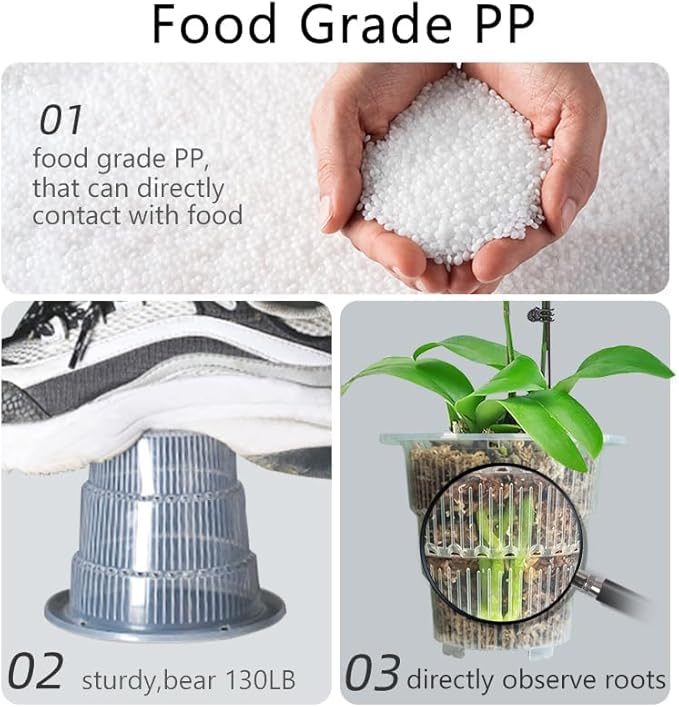 - Excellent Ventilation and Drainage,Avoid Root Getting Bad: 360° ventilation holes around the transparent orchid pot provide excellent ventilation and drainage,avoid root getting bad; the raised centre of the clear orchid pot, is our Patent “Air Cone",greatly increase the ventilation area of central part of roots;air cone also have grooves and holes, also develop more strong lateral roots inside the clear orchid pots.The bottom of outer pot also has ventilation holes to form good air circulation.