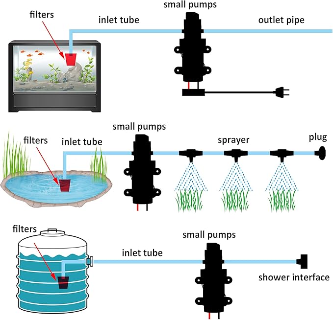 - Application: Before formal use, please connect the water inlet to the pressurized water supply pipe, and after a few minutes of power on trial operation, move it to the working environment. Please use DC12V 2.5A-4A power supply. IEIK fresh water pressure diaphragm pump can be used for automatic pump, ocean, ship, camper, RV, agricultural spray (weak acid and weak base) and truck.