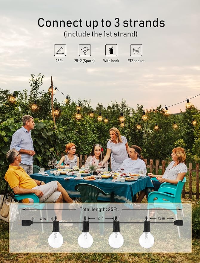 - 【Dimmable Compatible & Energy Saving】G40 outside string light come with 25 glass bulbs and 1 spare bulb. 1.5 inch light bulbs have E12/C7 candelabra socket base, 5W per bulb, warm white dimmable string light help you to save more electricity bill.