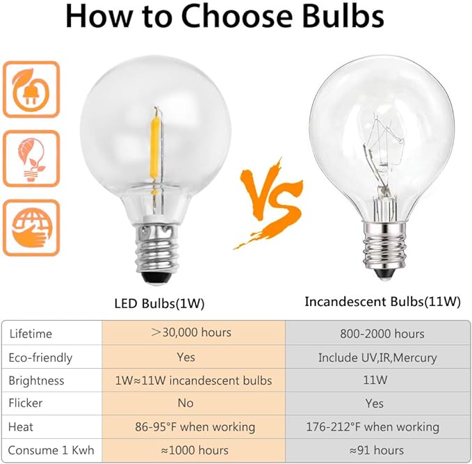 - 【25FT G40 Globe String Lights】Totally with 25 sockets(E12 Base),27 plastic clear G40 Bulbs( 2 spare),Shatterproof,save over 90% energy over incandescent bulbs.The 2700K soft warm lighting is perfect for creating romantic ambience for wedding,family reunion,party and etc.