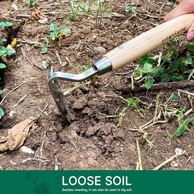 Berry&Bird Japanese Weeder-Scraper-Hoe, 12.67-Inch Gardening Sickle Hoe, Stainless Steel Bent Angle Weeding Sickle, Weeder Hoe with Ergonomic Ash Wood Handle for Weeding, Soil loosening, Digging
