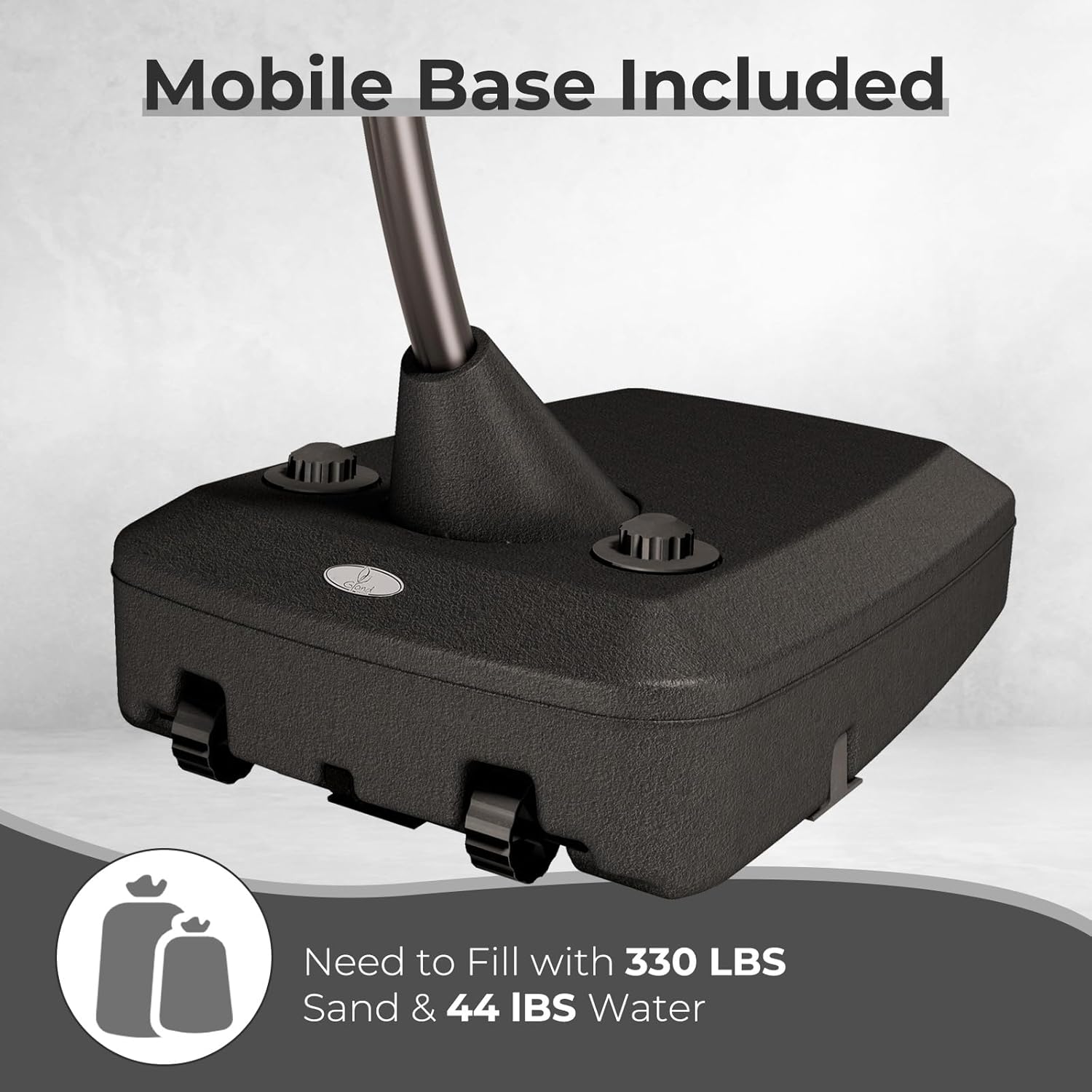 - STABILITY BASE WITH WHEELS: The outside umbrella has wheels for easy movement, in order to safely secure your umbrella, the base must be filled with 330 lbs sand and 44 lbs water, 374 lbs in total. Because of the risks of bad weather, it is best to close your umbrella into the deadlock position when you are not using it