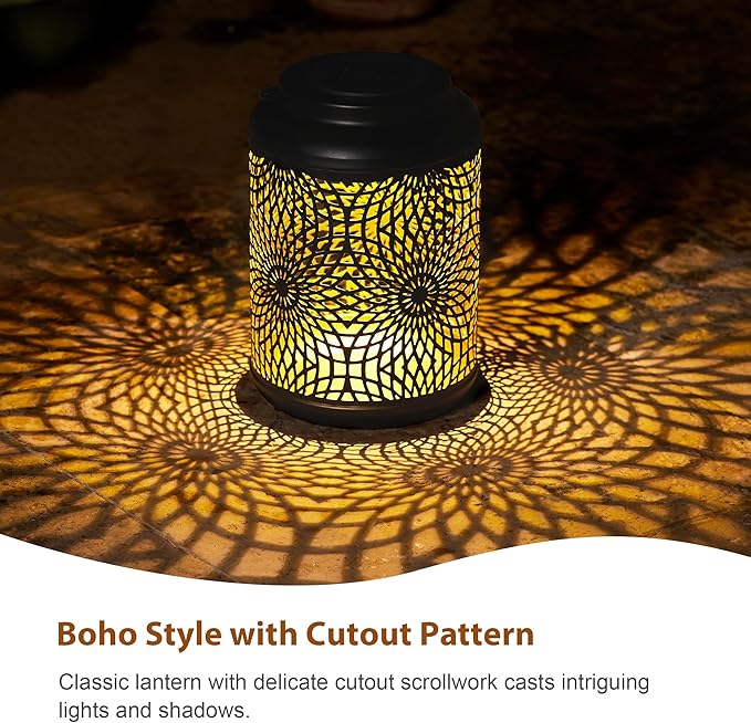 - SOLAR LANTERN DESIGN - The outdoor solar lights are modern and classic in design, with delicate openwork scrolling floral patterns and warm white LEDs that cast captivating glow, adding artistic beauty and visual interest to any space. They are the ideal fixtures to decorate patios, gardens, walkways, and yards