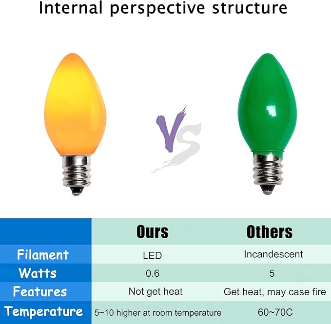 - 🎄 Energy Saving LED Bulbs: C7 multicolor christmas led lights bulbs- Red, Green, White, Orange and Blue bulbs, each bulbs 0.6 watt,120 Volt, C7/ E12 candelabra base led bulbs glow a 2700K warm white. Energy-saving c7 christmas lights replacement bulbs do not generate heat, and the temperature is lower than that of traditional incandescent bulb. low wattage will save more energy for you.