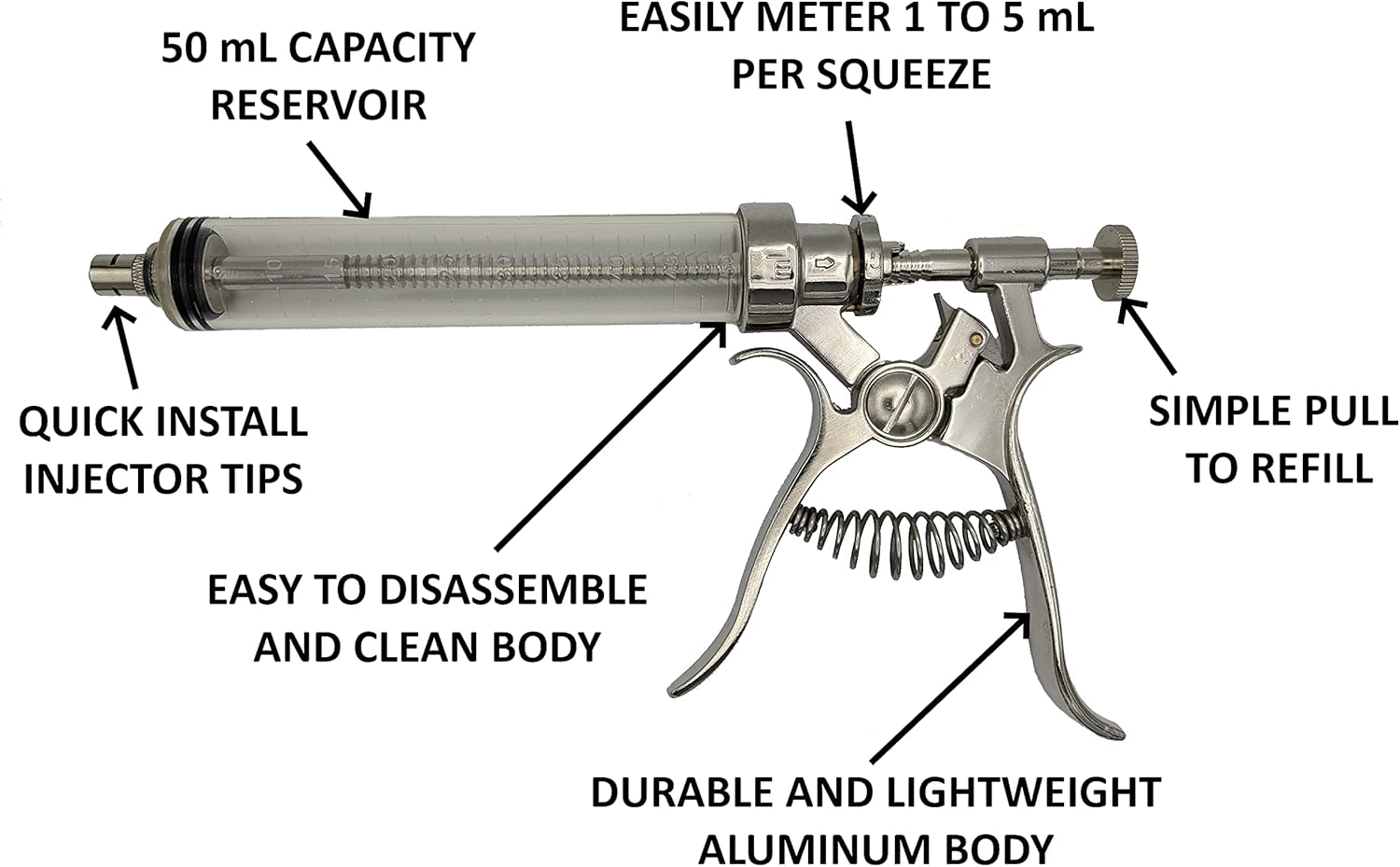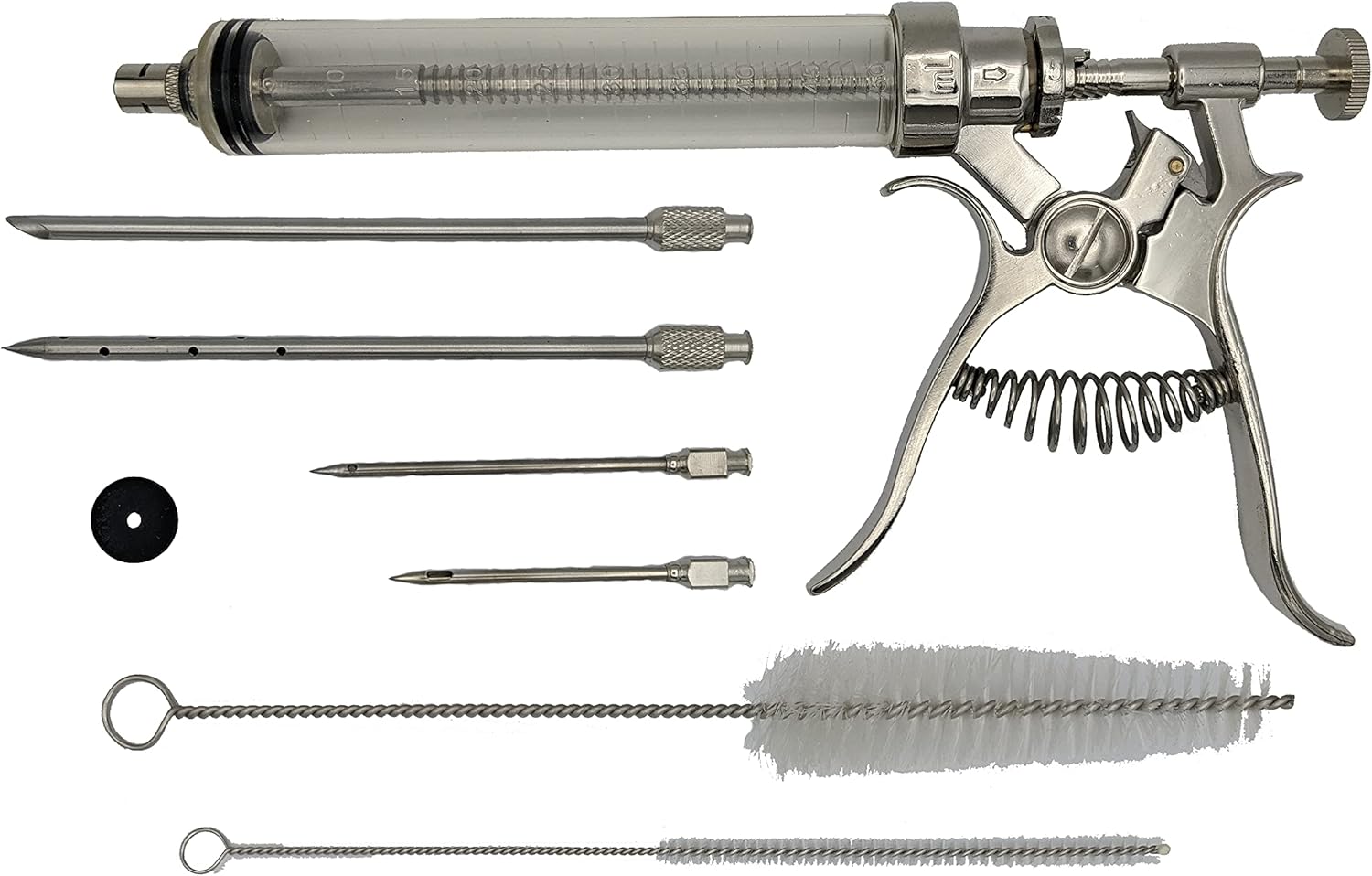 - Professional pistol grip meat injector syringe kit features an aluminum body, clear plastic syringe, four stainless steel needles, cleaning brushes, storage carry case and adjustable injection dose