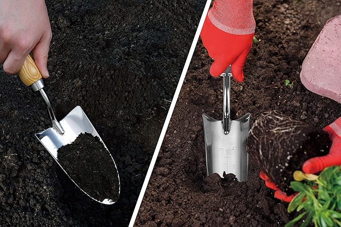 - 🍓Great Value with Original Design🥬 -- 5 Pcs Set Including Original Design Depth Mark 'T' Shape Dibber, Original Design '5-in-1" Weeding Trowel Fork, and 3 Pcs More Popular Large Trowel+Transplant Trowel+Cultivator, Suitable for All Major Gardening Tasks Such as Seeding, Transplanting, Digging, Weeding, Loosening Soil, Cutting, etc.