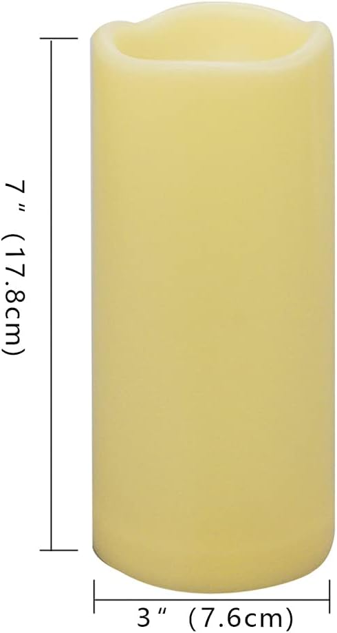 - 【500 Hours Long Lasting Battery Life】Each warm white remote control led flicker flameless candle is powered by 2 AA batteries (NOT INCLUDED), and made of premium flickering IC and bright glow LEDs. The 3in x 7in led big dark ivory pillar candles can shine for 500+ hours. Save money on batteries.