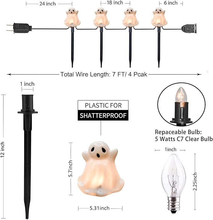 - ☛Halloween Ghost Pathway Lights: 7 Ft Halloween pathway marker lights with 4 white ghost lights, 4 plastic stakes, 24 inch lead with male plug, 12 inch spacing between white ghosts lights, 6 inch tail with female connector