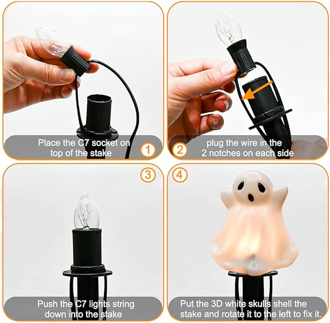 - ☛Safe and Energy Saving: Halloween Walkway ghost stakes lights with 4 C7 clear bulbs E12/C7 candelabra socket base, 5W per bulb, UL Listed for indoor and outdoor use. If a light bulb that goes out does not affect other lighting bulb, a spare fuse stored in lead plug.