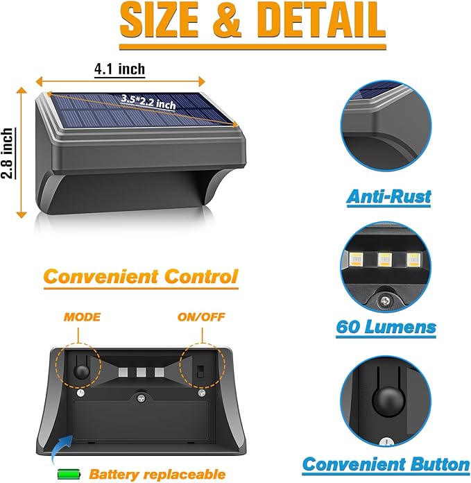 - 【Wide application】Perfect modern look accent solar fence lights, 60lumens brightness lighting for your fence, wall, patio deck, step, deck railing, fence post. Give your house a circle of downward emitting light. Solar fence lights providing some bright but not harsh lighting for your family in the yard. You can install it on different position such as vinyl fence, wooden fence, iron fence,retaining wall. Nice addition to your outdoor landscaping and ambiance.