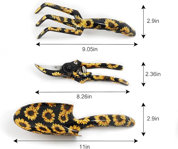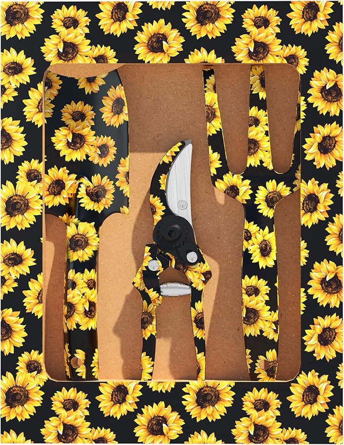 GARTOL Garden Tool Set - 3 Piece Thickly Cast Aluminum Gardening Tools Kit with Flower Paint, Heavy Duty Hand Garden Tools with Box Include Trowel, Rake, Pruner Shear, Gift for Gardener (Sunflower)