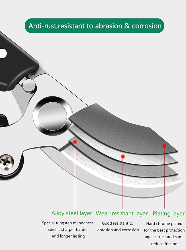 • SPECIAL PROCESS: The blade is quenched and hardened at high temperature,hardness reaches above HRC62, can cut branches up to 1 inch diameter. The blade is hard chrome plated for the best protection against rust and sap, reduce friction, increase smoothness, and extend service life.