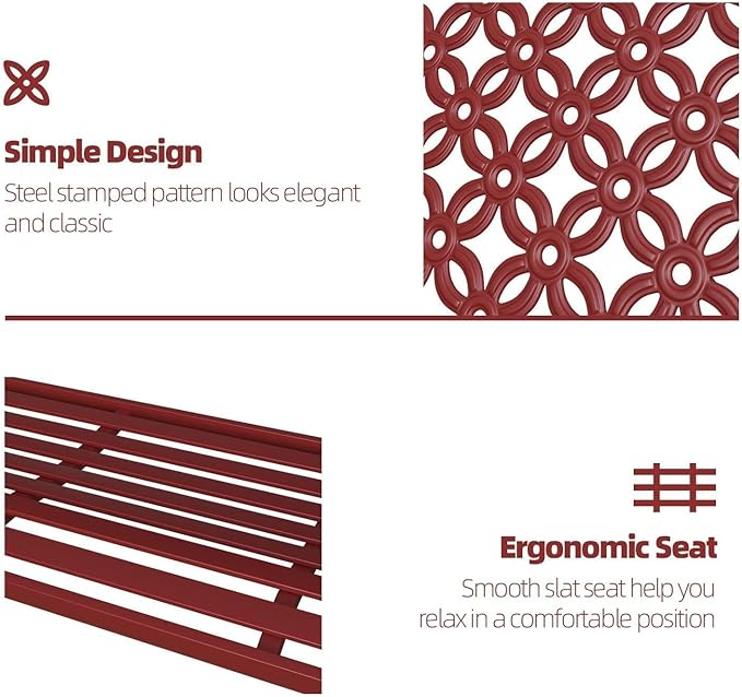 - Strong Structure: This sturdy, full-size patio bench is made of thickened steel back and seat, wider and stronger armrests and backrest design makes you feel more comfortable. Max load capacity reach 660 lbs