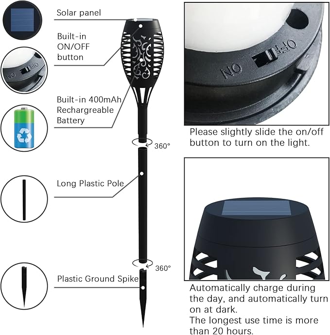 - đ„ăAuto Charge & Auto Light Upă: Solar tiki torches for outside automatically collect solar energy all day in direct sunlight and turn it into electricity to continuously charge the battery and include a photosensitive control switch on its solar panel, From dusk to dawn (no sunlight), the lights are automatically turned on, and when the sun rises (the solar panel receives sunlight) the lights will automatically turn off and charge automatically. Convenient and practical.