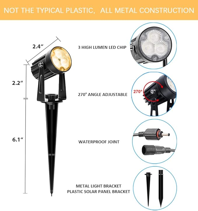 - 【2 installation methods】Easy to install:The solar panel and outdoor solar landscape lights can be installed in the ground or mounted on the wall with included screws. Each solar garden spot lights with 118inch/3m cable, 270° Adjustable freely up or down to meet different requirements