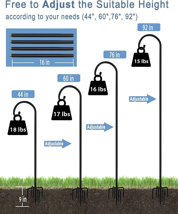 - Extendable & Tall Hook Hanger: The outside shepherd’s hook hanger made of 3/5 inch width & 2mm thickened steel pipe with 7 solid anchor points, you can free to adjust the suitable height for 92", 76", 60 " or 44 ", and also make it stands firmly in the ground without easily falling down, no fear of severe weather such as strong winds, heavy rains, and blizzards, (1 PACK / SET)