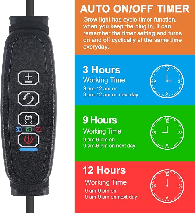 - đ±ăTimer Function & Multiple SettingsăThe indoor seedling light offer the circular memory timer function with 3 options-3h/9h/12h. When keeping power, it can automatically turn on and off every day according to your settings.ă You Could Operate One of Them Separately and Support 5 Levels of Dimming.ă