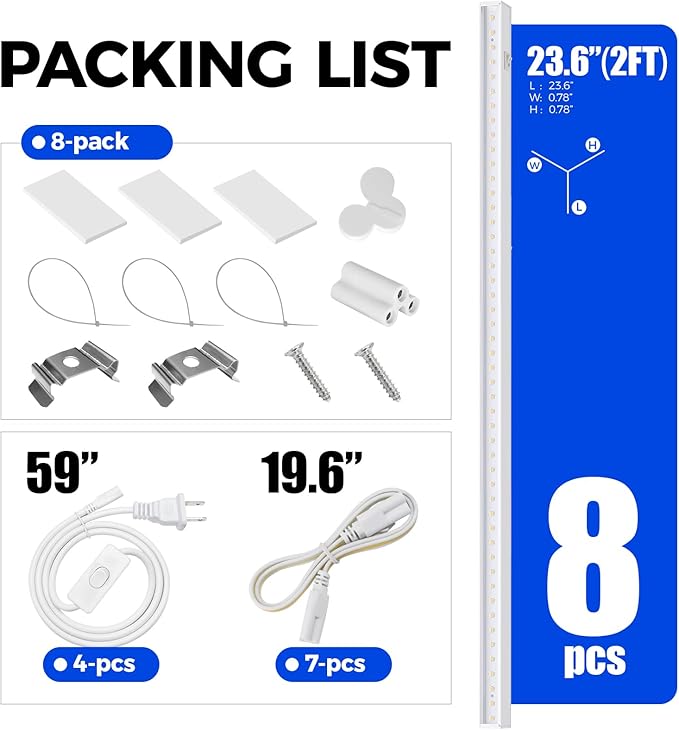 - What You Get: 8 x Barrina T5 Grow lights, 4 x Power Cords with ON/OFF Switch, 7 x Connecting Cords, 8 x Small Connectors, 16 x Installation Clips, 24 x Double-sided Tapes, 24 x cable ties