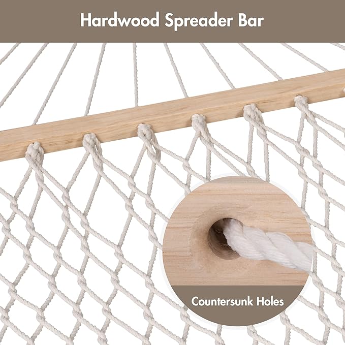 - SPREADER BAR HAMMOCK: 52 inches hardwood spreader bar has countersunk holes, hence reducing the friction between the rope and wood, offering maximum durability and stability. Our hammock significantly outperforms others’ non-countersunk varieties