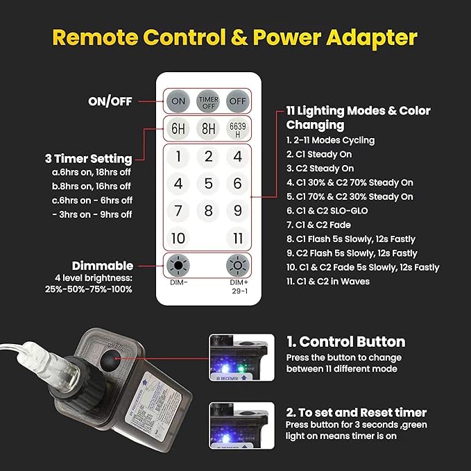 - 11 Lighting Modes: 11 Lighting Modes has been updated to replace the previous 8 modes. They are vibrant.warm steady on, multicolor steady on, warm and multicolor steady on, warm and multicolor slo-glo, warm and multicolor fade, warm flash 5s slowly and 12s fastly, multicolor flash 5s slowly and 12s fastly, warm and multicolor 5s slowly and 12s fastly, warm and multicolor in waves.