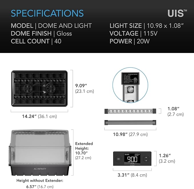 AC Infinity Heavy Duty 3mm Thick Humidity Dome Germination Kit with LED Grow Light Bars, Drip Tray, Seedling Tray, Vented Height Extension Panels for Seed Starting, Cloning, Indoor Gardening