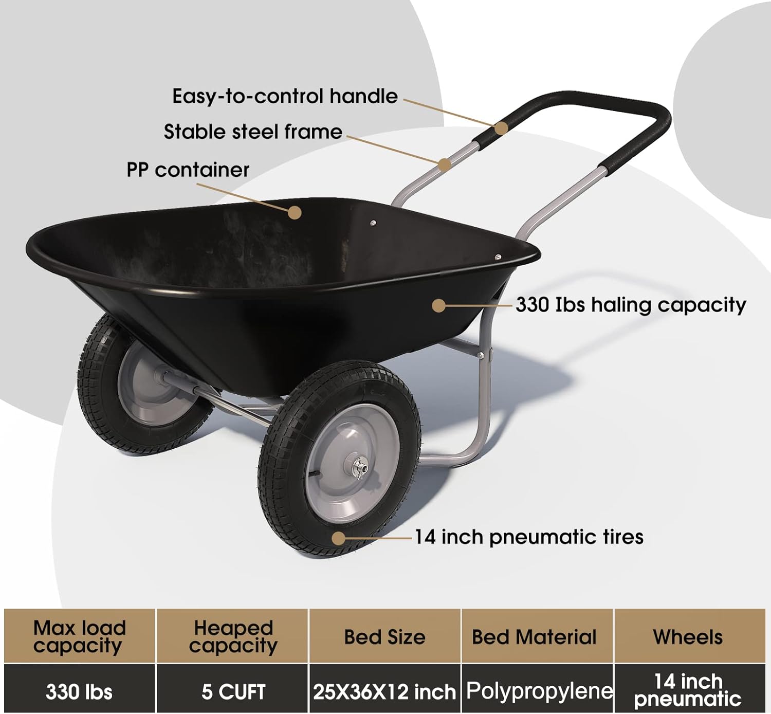 - ✅Stability - The dual-wheel design of this wheelbarrow is better suited for lifting heavier loads, and the two wheels ensure more stability. 330LBS weighing capacity is perfect for the home gardener or professional landscaper.