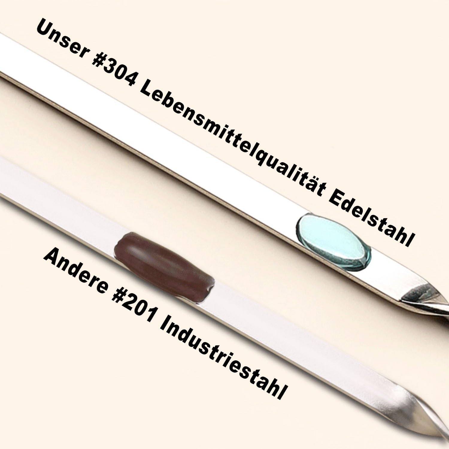 - 【304 barbecue skewers have weak magnetism】304 stainless steel is non magnetic or weakly magnetic. 304 stainless steel may have weak magnetism because during the processing and forging process of the product, a small amount of austenite is converted into martensite, so 304 stainless steel may have a little magnetism. Our barbecue skewers may have a slight magnetism due to the processing of the tip and handle, which is a normal phenomenon.