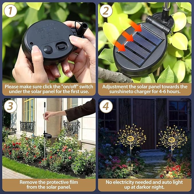 - HIGH-QUALITY MATERIAL:Firework lights outdoor are made of high-quality 150 LED lamp beads and 50 soft copper wires. Even if you work for a long time, it will not make solar garden lights outdoor hot.It is safe, durable and impact-resistant, and fireworks solar lights outdoor haveIP65 water proofing,rainy days will not affect the normal operation of the firework lights