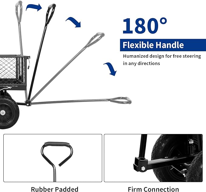 - VERSATILE & CONVENIENT: This yard cart is not only ideal for gardening tasks but also useful for various outdoor activities. Whether you're hauling firewood, tools, or other supplies, this cart are versatile and reliable. With its durable construction and no-flat tires, you can trust that this cart will handle any job you throw its way.
