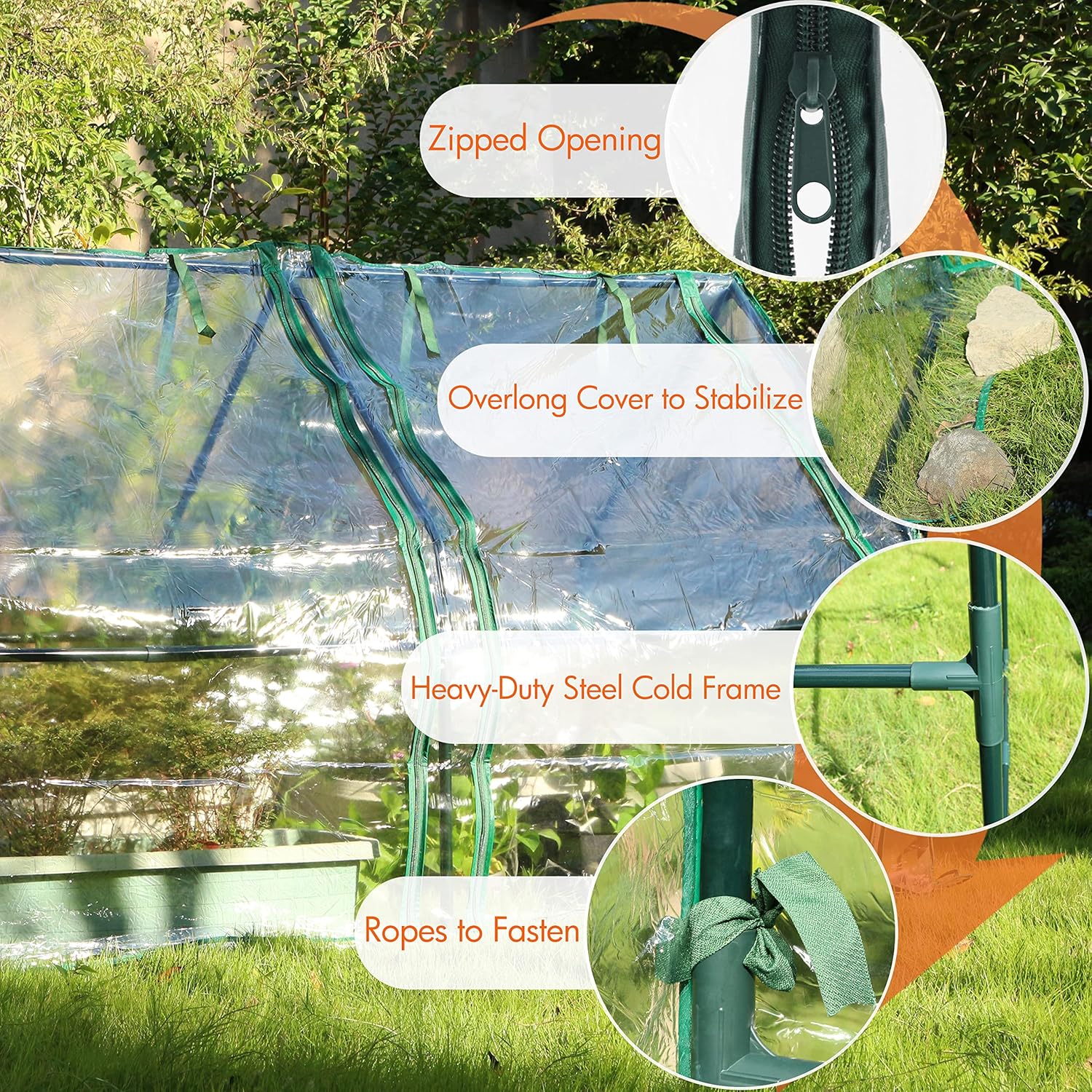 - Sturdy Frame - High quality steel framework is heavy duty to protect plants against extreme weather. Easy to setup and use with no tools assembly required. The clear cover should be tied to the frame preventing from blowing away. The portable greenhouse is lightweight and stable to be a shelter for your plants to extend the growing season.