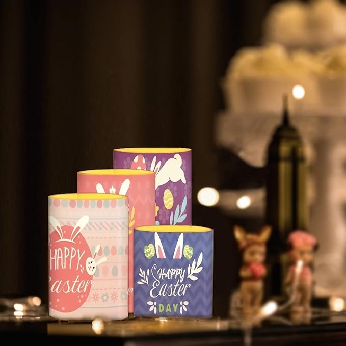 Happy Easter Flameless LED Battery Candles 4PCS Pillar Candles with 18-Key Timer Remote Color Changing Lights for Easter Party Day Celebration Decor, Cute Floral Bunny Rabbit