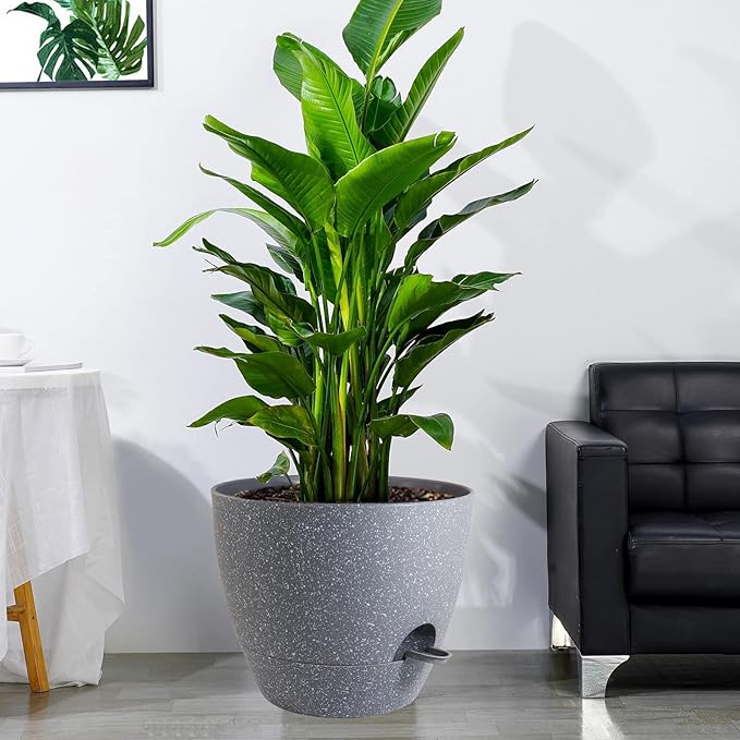 12 inch Large Self Watering Pots, Plastic Planters with 60oZ Removable Deep Reservoir and Multi Mesh Drainage Holes for Indoor Outdoor Garden Plants and Flowers, Grey Speckles