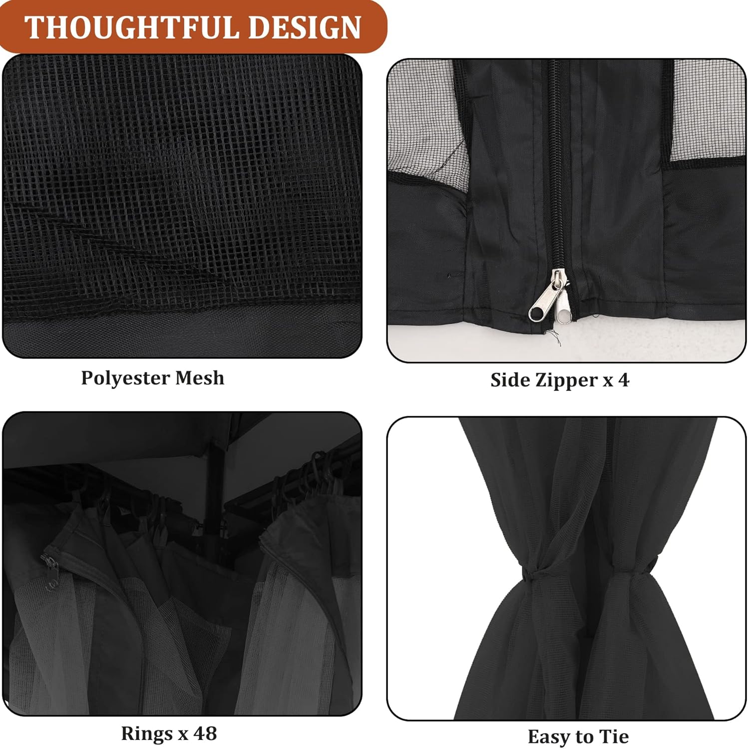 - 【EASY ASSEMBLY&REMOVEL】 The replacement mosquito netting can be easily hung on the beam of the gazebo canopy, it comes with up to 48 curtain rings. Ties on the net secures the net on the post to prevent it from swinging widely due to the windy.