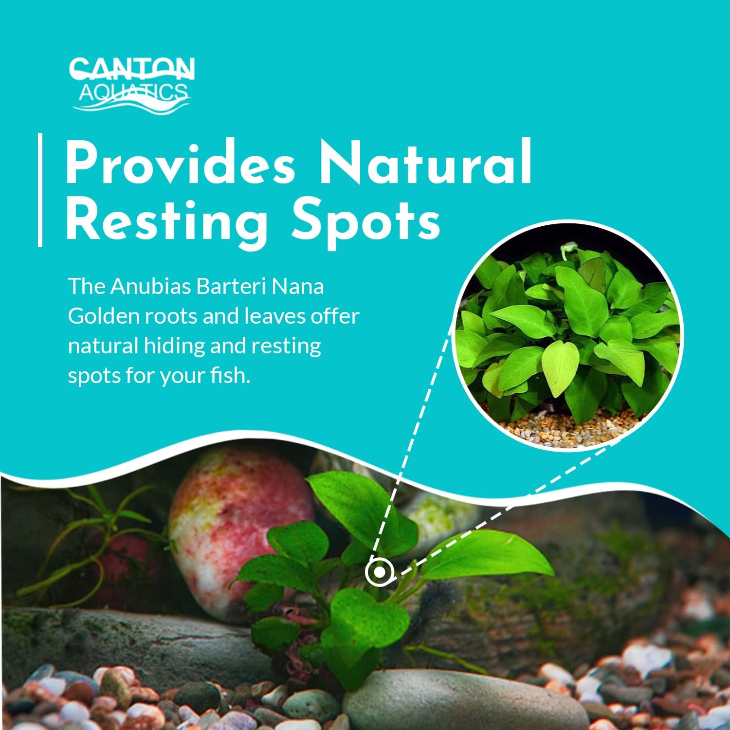 - NATURAL RESTING PLACES: The Anubias Barteri Nana Golden roots and leaves offer natural hiding and resting spots for your fish. These plants provide a natural and secure environment for all aquatic inhabitants.