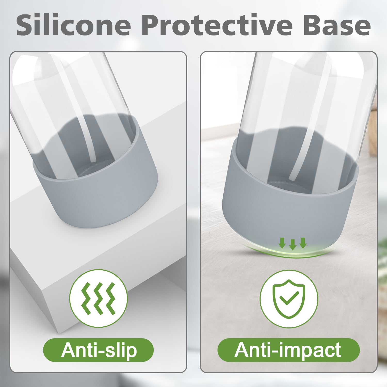 - Silicone Sleeve Protection: The bottom of the glass spray bottle is protected by an added silicone sleeve. The soft silicone is non-slip and slows the impact on the bottle, making glass bottle more sturdy.