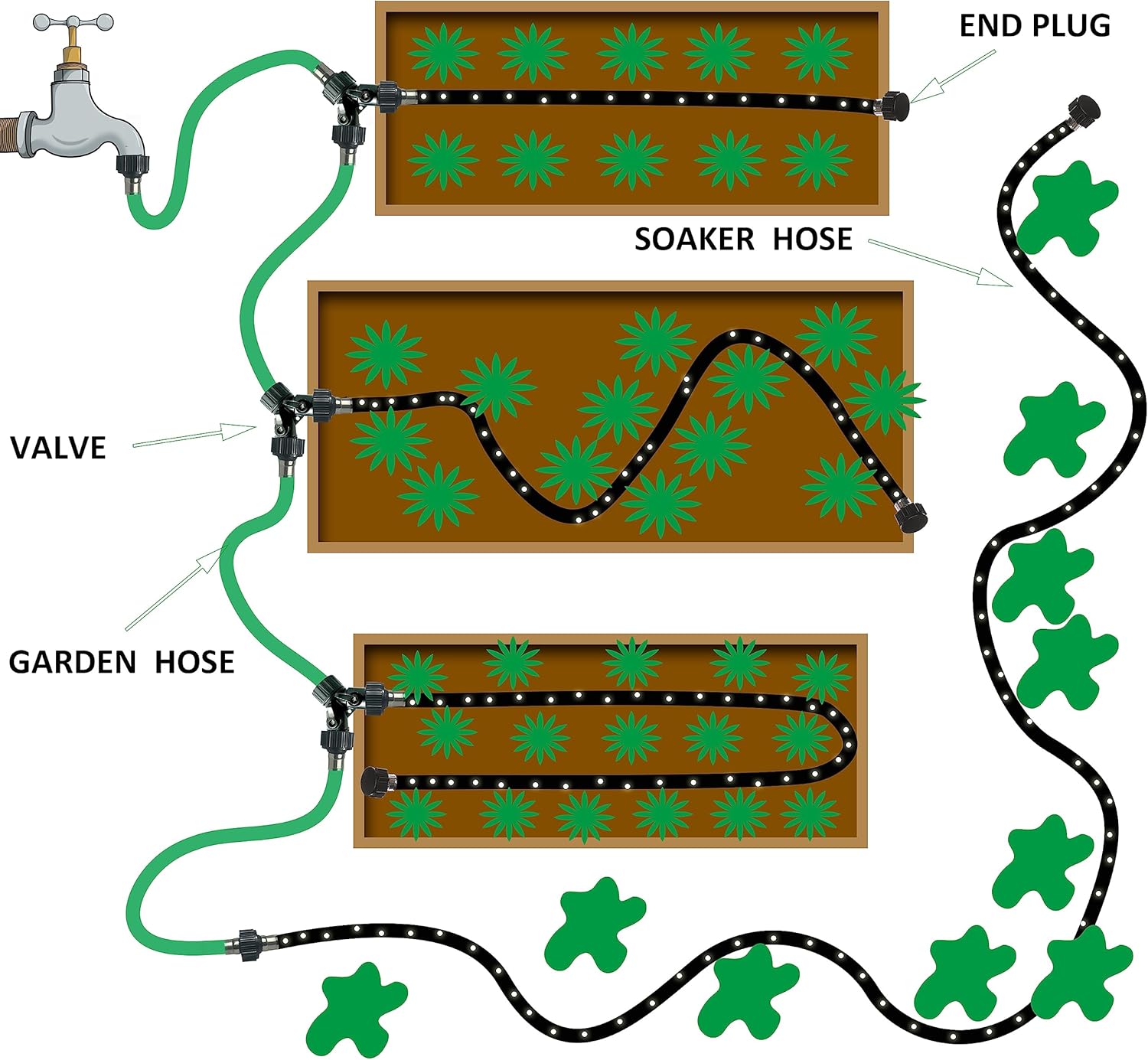 - [PACKAGE INCLUDE]----1/2"x15ft soaker hose*4 pcs; 2 Way hose splitter with shut off valve*3pcs; Garden stakes*10pcs