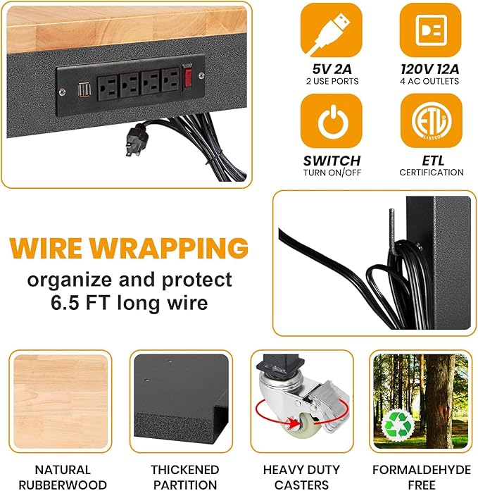 48"/60'' Adjustable Workbench, Rubber Wood Top Work Bench Heavy-Duty Work Table with Power Outlet, Wheels, Partition 2000 LBS Load Capacity Hardwood Work Benches for Garage, Workshop, Home, Office