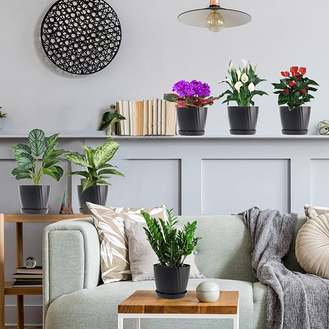 - DECORATION YOUR HOME GARDEN - 6 pack 7 inch planters with grey color, transplant plants to these pots, fill up with mix soil, water and let drain, then place a saucer under each plant. Brings a new stylish home garden. Pefect for hanging up or placed on windowsill, shelf, bedroom, kitchen, office, desktop, garden, etc.