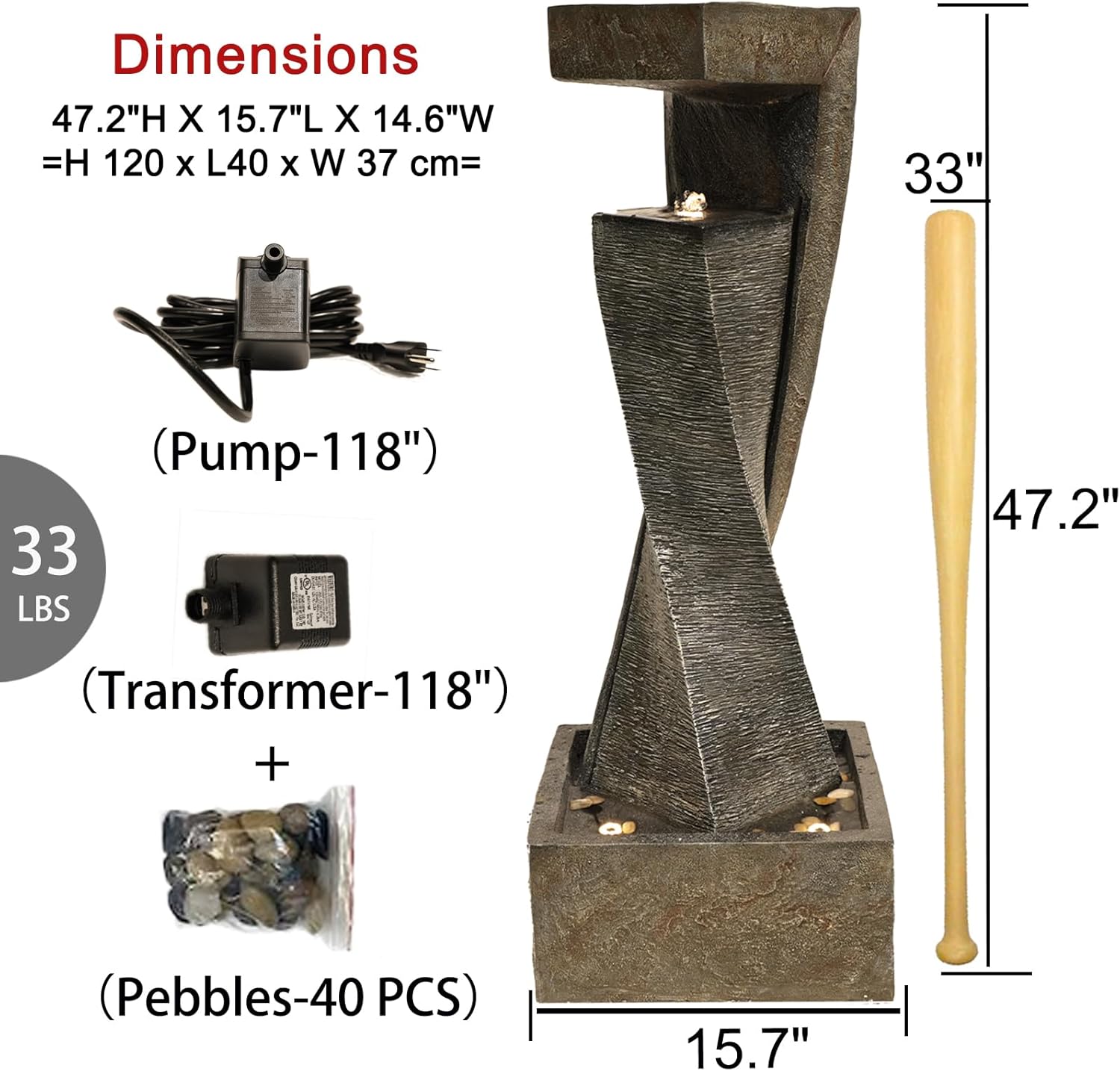 - SIZE & PACKAGE: Measures 15.7"L X 14.6"W X 47.2"H to Fit Almost Any Outdoor Area. Easy to assembly including Pump and Lights,110V~120V 60HZ Input US Plug, 6ft Power Cord. Package: Outdoor Fountains(33LB)*1,Transformer*1,Pump*1,Pebbles*1,Instruction*1.