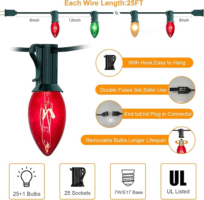 - Effortless Connectivity and Energy-Efficient: Featuring E17/C9 candelabra socket bases, christmas lights red green white are designed for hassle-free end-to-end connection, covering up to 25 feet effortlessly. With 120 Voltage and 7 Watts per bulb, totaling 175 Watts, they are energy-efficient, saving you on electricity costs while brightening up your space.