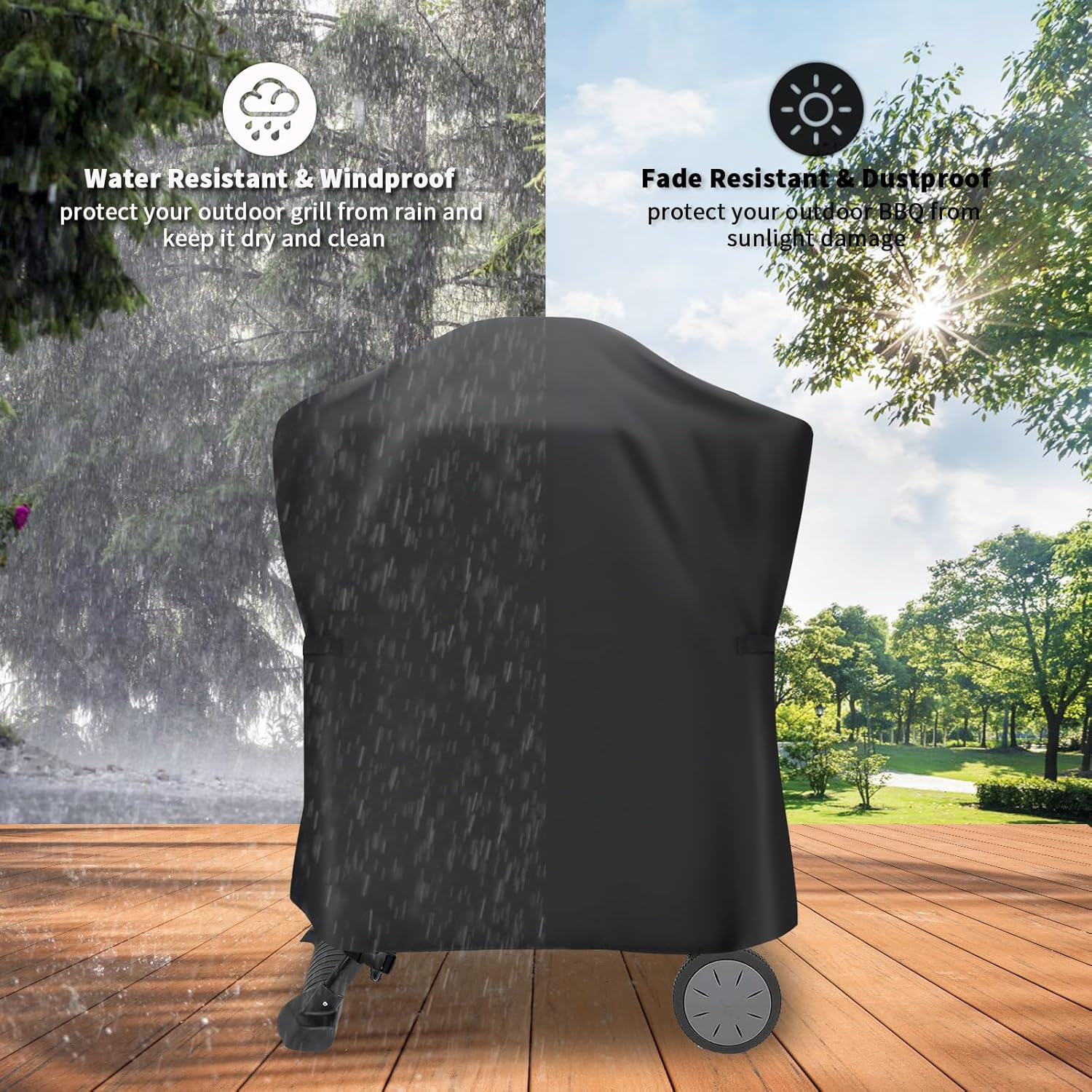 - USER-FRIENDLY DESIGN: The dustproof grill cover has two handles for taking off easily. And the design of the air vents on the side can make sure your bbq grill would not go moldy easily.
