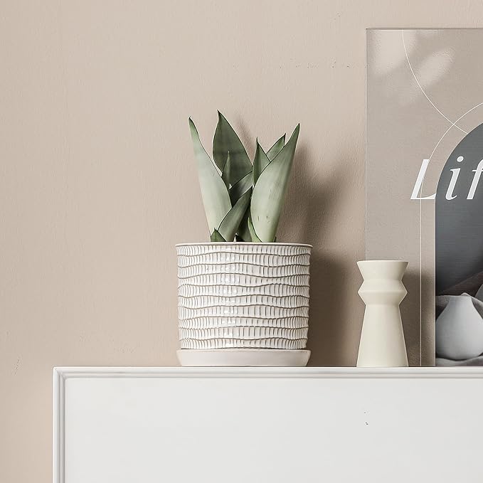 8 Inch Plant Pot: Ceramic Planter with Drainage Hole & Saucer - Cream White Flowerpot for Indoor & Outdoor Plants - with Separate Tray for Home & Office - Wave Embossed Design