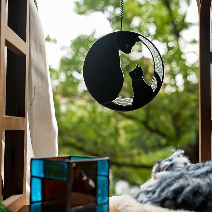- BLACK CAT DECOR: This stained glass window hanging is made of a black cat mom is sitting with a baby cat on the window playing. This warm scene can evoke people's fond memories of their cat and makes people feel warm when they look at it. The cat decor stained glass suncatcher is a great cat memorial gift for cat lover. It can make people remember precious moments with cat and bring consolation to their mind.