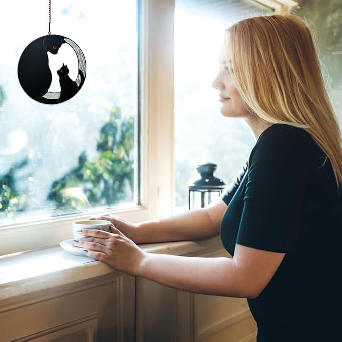 - CAT SUNCATCHER FOR WINDOW: The stained glass window hanging is timeless and never losing its luster like the love between you and your loved cat. The black cat stained glass window hangings makes the wonderful combination of visual interest and stunning artistry. Cat stained glass suncatcher can create some gorgeous and unique lighting patterns when the sun shines through them.