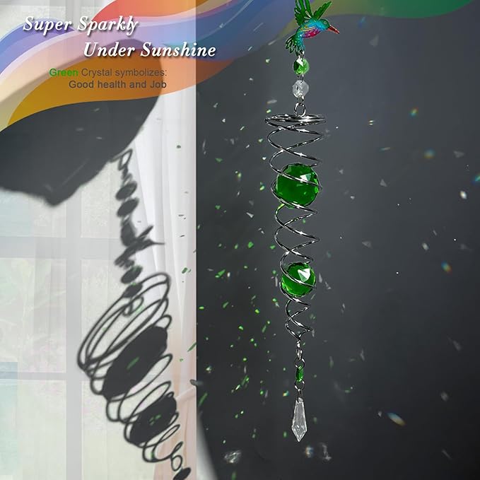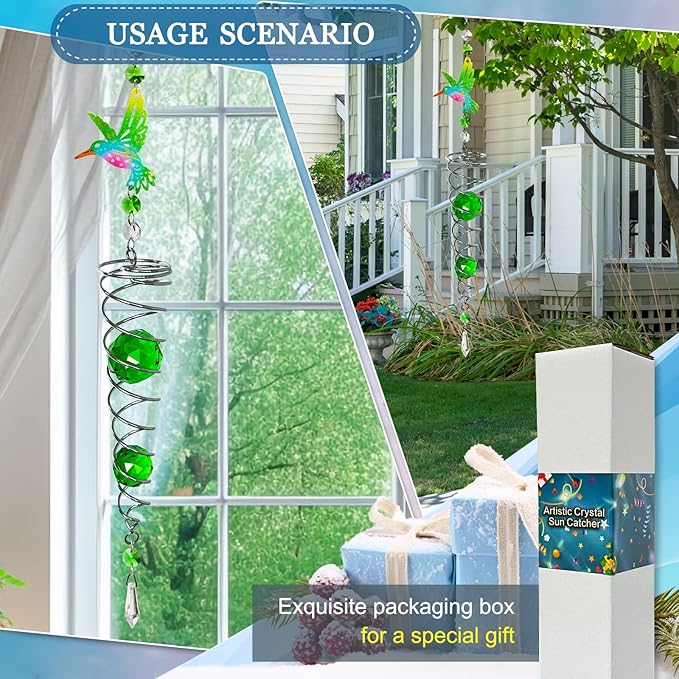 - 【HIGH QUALITY】:FONMY hummingbird Crystal wind spinner sun catcher is made of stainless steel wire with K9 crystal material, special double structure spiral tail w/ solid color K9 crystal glass ball,promised good weather resistant and amazing decoration. All FONMY crystal ball made of top crystal glass material with finely crafted, high clarity and cast beautiful rainbows, could turn the sun's rays into many rainbows.