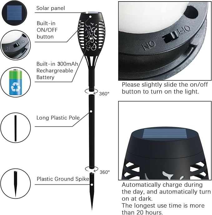- 🔥【20Hrs Working Time & With Daylight Sensor】Solar christmas lights outdoor has a built -in large -capacity battery and high -efficiency solar panels, with a conversion rate of up to 20%. Through the daylight Sensor, solar torches with flickering flame can quickly charge in direct sunlight, The Solar torch lights lights up to 10-20 hours in summer and 8-15 hours in winter when fully charged. (Note: The charging time in the sun is at least 6-8 hours. The lighting time is affected by the weather)
