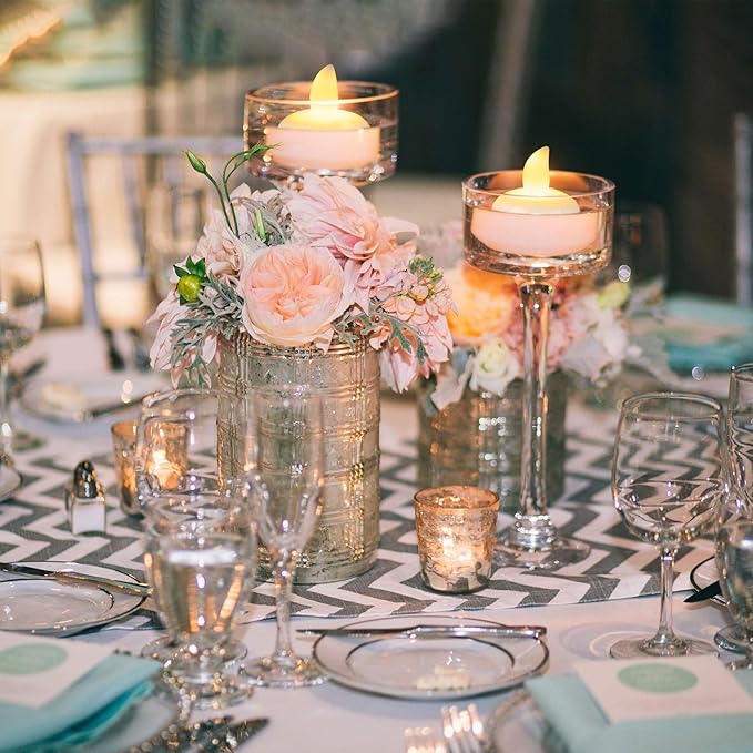 - 【Versatile floating candles】Use tall or short glass cylinder vases, bowls, goblets, mason jars, or cocktail glasses as candle holders and adorn them with faux rose petals, blue or gold faux pearls, gel beads, crystals, artificial ice cubes, or LED fairy lights. These bulk flameless flickering tealights are ideal for wedding centerpieces, parties, baths, restaurants, Christmas dinners, and Halloween decorations.